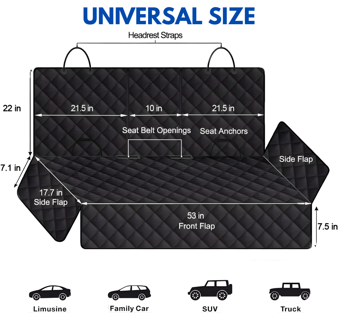 【Universal Size for Cars】: Measures approximately 53” long x 47” wide. This rear seat cover fits most cars, trucks, and SUVs, including those with baby car seats. It protects your back seat from dirt, scratches, and stains.